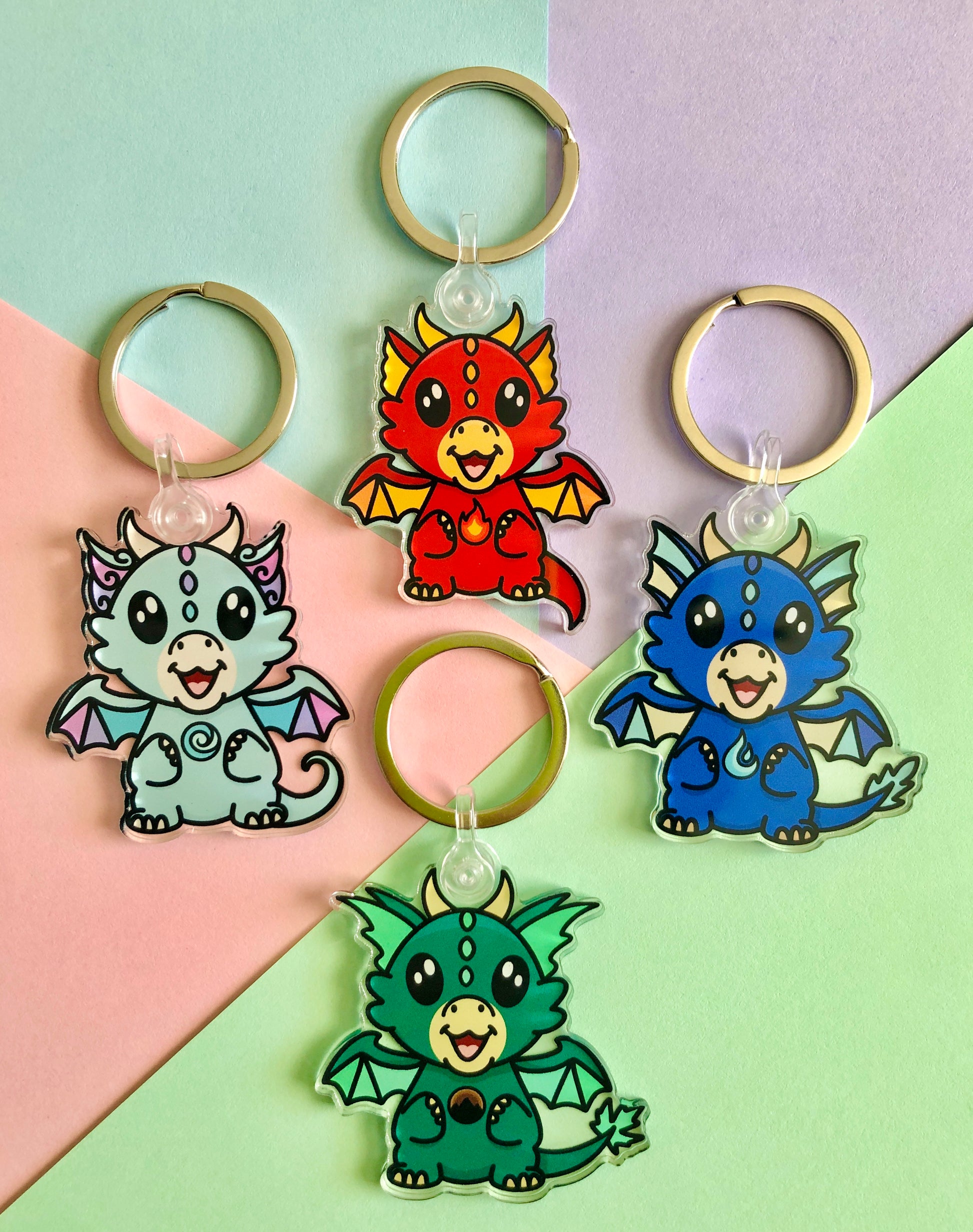 The Baby Air Dragon acrylic keychain measures 3.5 x 2 inches, with the keyring.