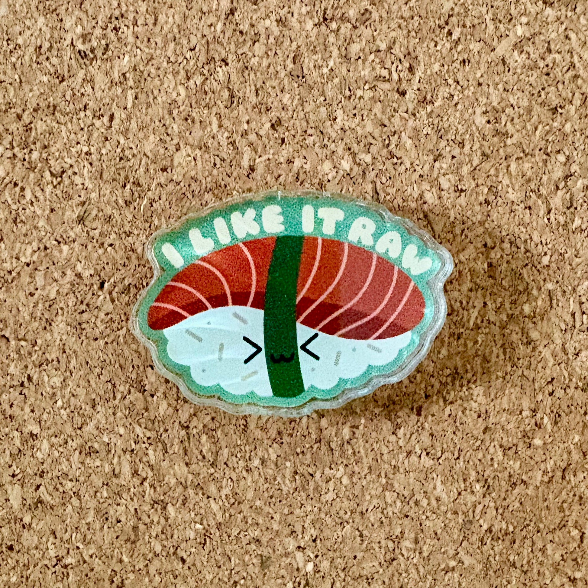 The I Like It Raw sushi acrylic pin measures 1.25 inch by 0.875 inch.