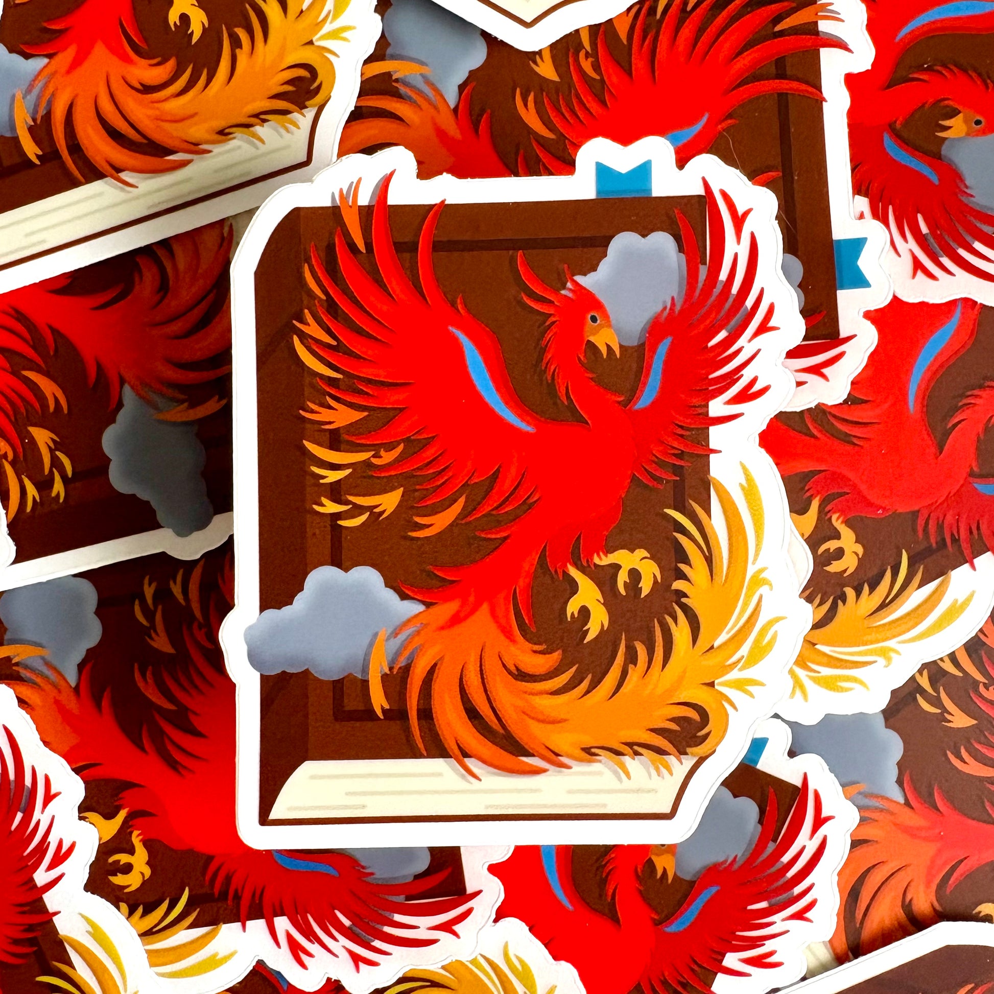 The Phoenix Mythical Book vinyl sticker measures 3.5 x 3 inches.